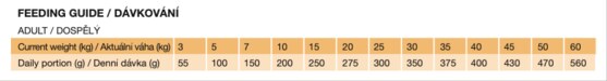 NÁVOD K POUŽITÍ: Jídlo podávejte suché, nebo zalité vodou. Po úvodním období krmte svého psa denními dávkami podle hmotnosti psa na tabulce. Doporučená denní porce je pouze orientační. Množství denního krmiva závisí na kondici a věku psa. Pokud má pes nadváhu, snižte denní porce o 10 %. Pokud má pes podváhu, zvyšte denní dávku o 10%. Vždy by měla být k dispozici čistá, čerstvá voda. Skladujte na suchém místě.