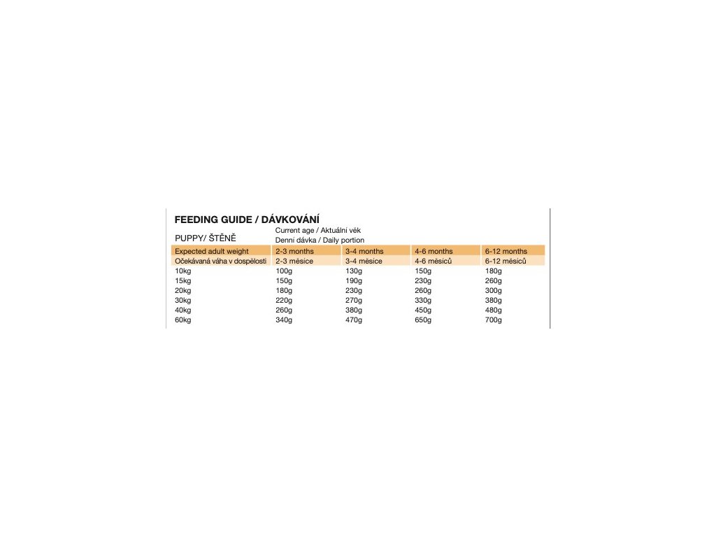 NÁVOD K POUŽITÍ: Jídlo podávejte suché, nebo zalité vodou. Po úvodním období krmte svého psa denními dávkami podle hmotnosti psa na tabulce. Doporučená denní porce je pouze orientační. Množství denního krmiva závisí na kondici a věku psa. Pokud má pes nadváhu, snižte denní porce o 10 %. Pokud má pes podváhu, zvyšte denní dávku o 10%. Vždy by měla být k dispozici čistá, čerstvá voda. Skladujte na suchém místě.