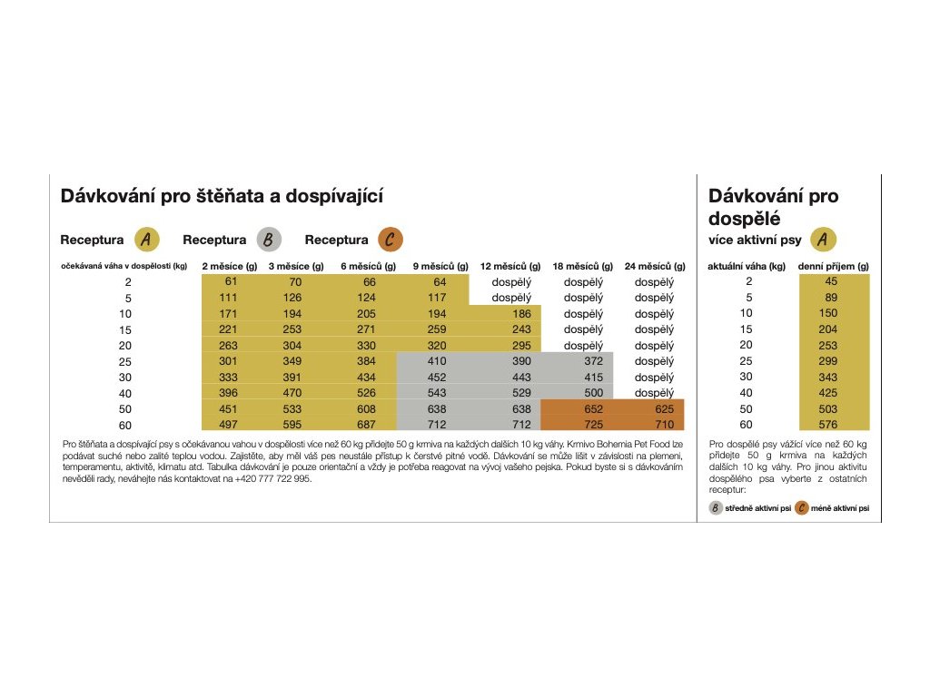 Receptura C je oslabebější receptura v řadě BOHEMIA. C receptura obsahuje nižší hladiny bílkovin, tuků a energetické hodnoty, ale oproti recepturám A,B má vyšší hladiny ovoce, zeleniny, vlákniny, vitamínů a minerálů. Proto je vhodná pro štěňata obřích plemen viz. tabulka dávkování. Dospělé psy v nízké aktivitě a starší psy v běžné aktivitě.
